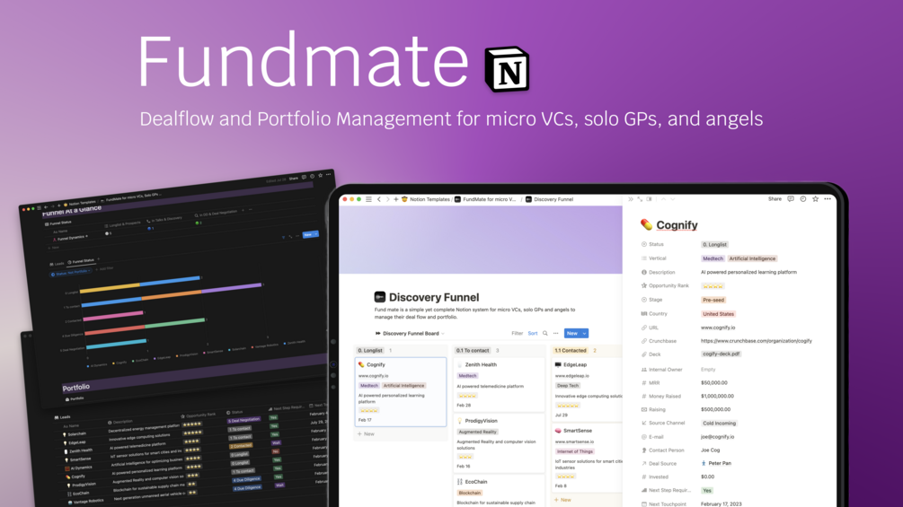 Introducing Fundmate, the simple and affordable Notion template for micro VCs, solo GPs, and angels.