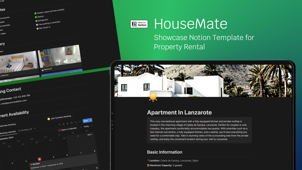 HouseMate is a streamlined Notion template designed to visually showcase your rental property, whether it’s a vacation home, an apartment for digital nomads, or a room for rent. This one-page template offers a beautiful and comprehensive online presence for your property, enabling you to highlight essential details such as property descriptions, policies, pricing, amenities and availability in visual calendar.