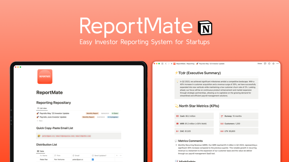 ReportMate is an easy to use 1 Page Notion template for any startup to handle regular investor updates - create a re-usable (pre-populated with best practice structure) template, manage your distribution list, keep all the investor updates in one place and more.